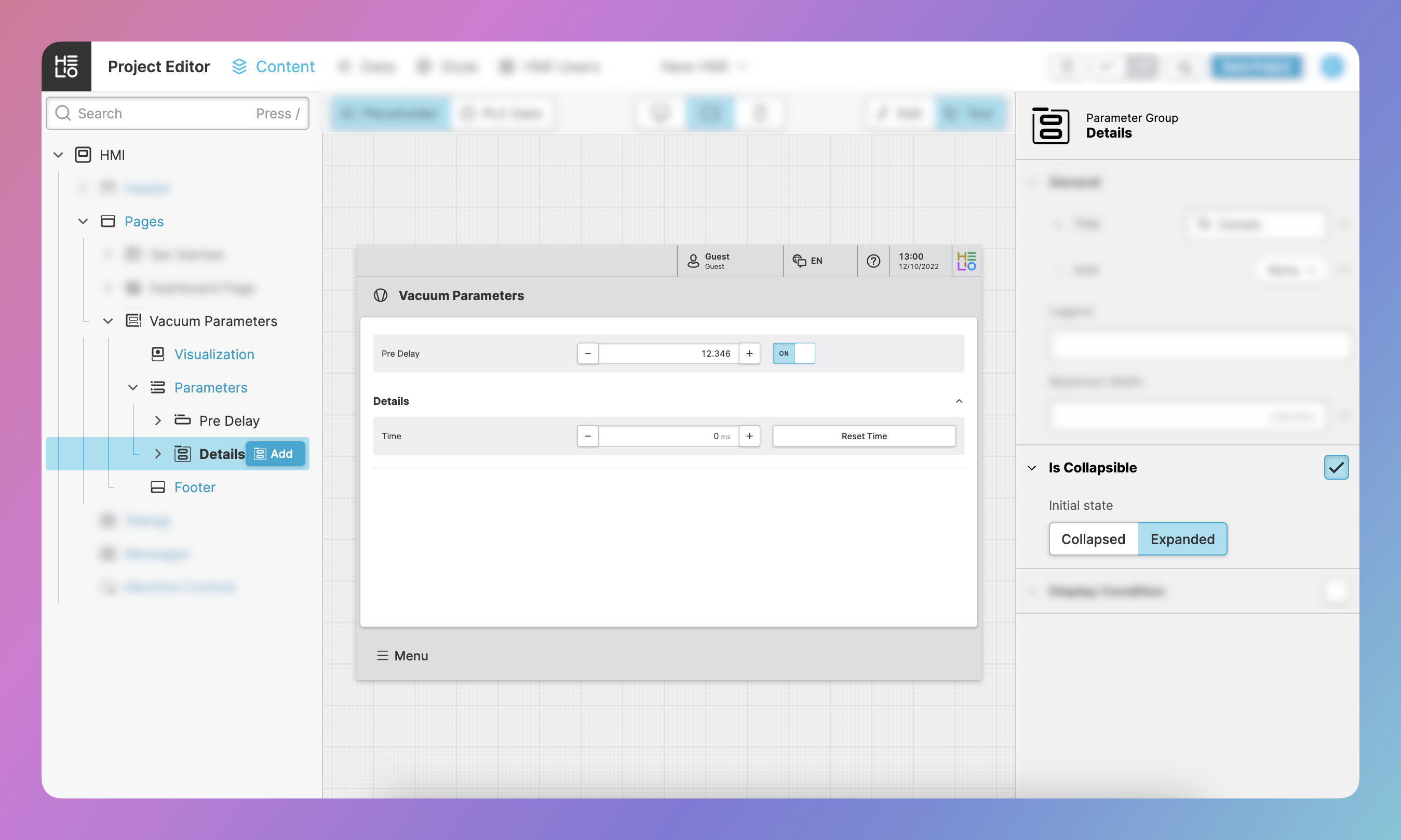 Our operators won’t need to edit these details all the time, so we want to safe some space on the parameter page and make this group collapsible.