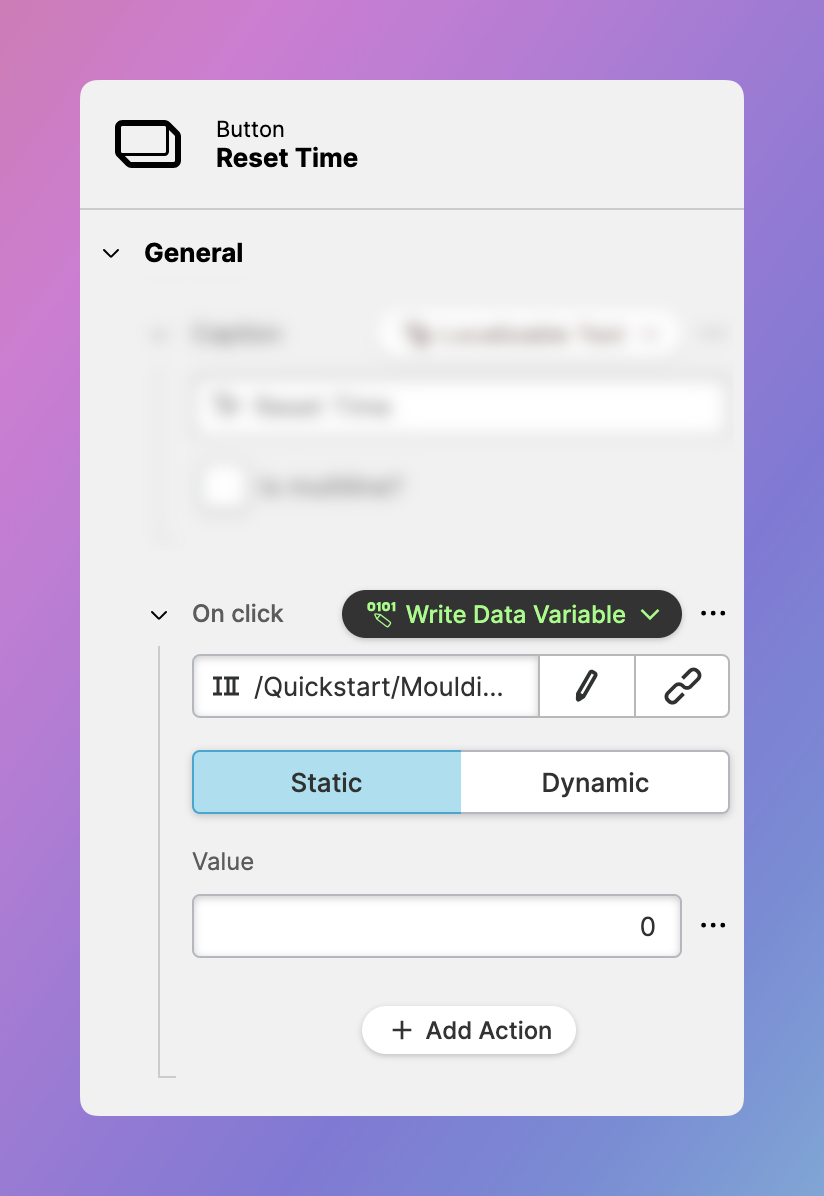 Write Data Variableaction from theSelect Actiondialog. TheChoose Data Variabledialog will open automatically, so select theQuickstart > Moulding > Vacuum > TimeData Variable and confirm. - Now you can choose to which value you would like to set the “Time” Data Variable when an operator clicks the “Reset Time” button. Since we always want to reset the variable to the same value, we will select a static value and set it to “0”. And you’re done!