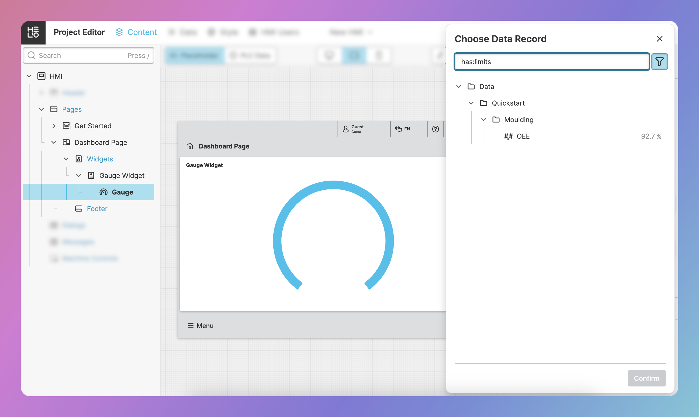 Quickstart > Moulding > OEE. Your PLC experts have defined this variable in a previous workshop, and it already has a placeholder value of 92.7%. Select it andConfirmyour selection.