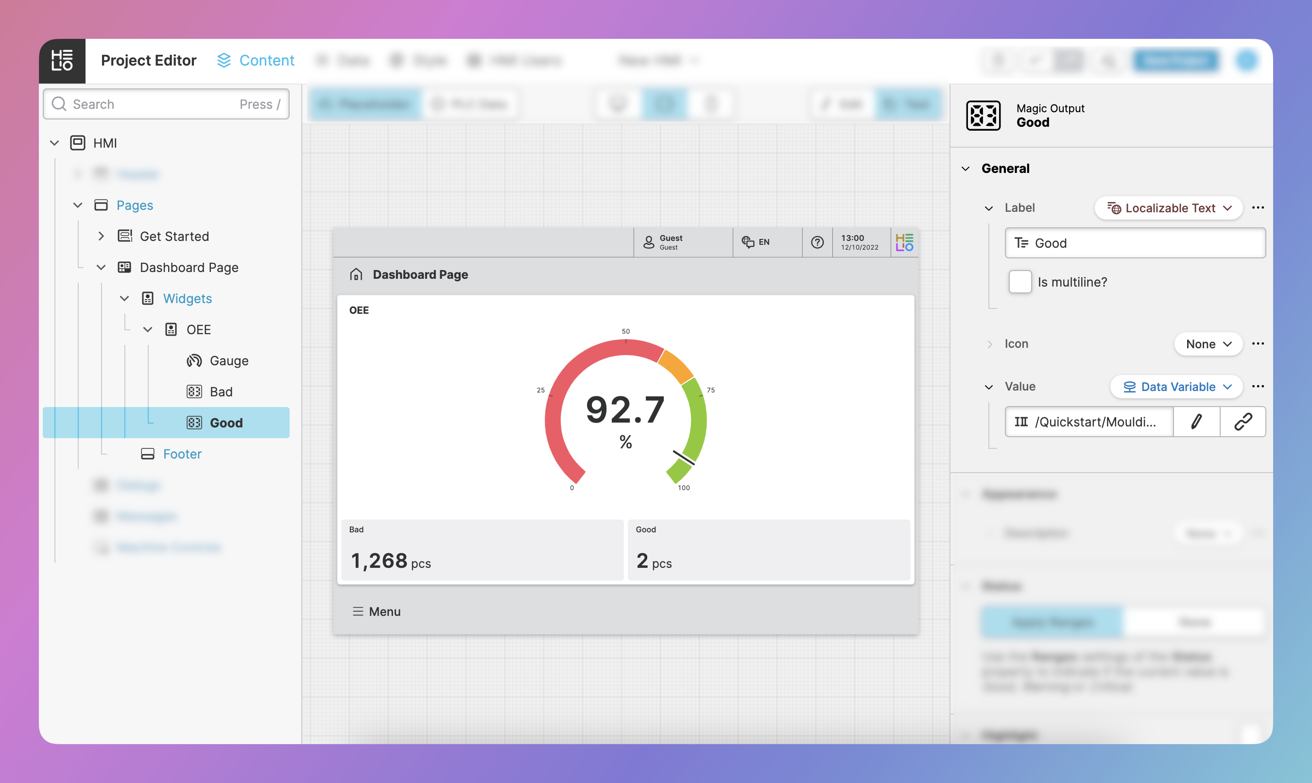 We would like to display the OEE in the form of a gauge and some additional numbers related to our production quality. Let's start with the gauge, since it will be the eye-catcher of our dashboard.