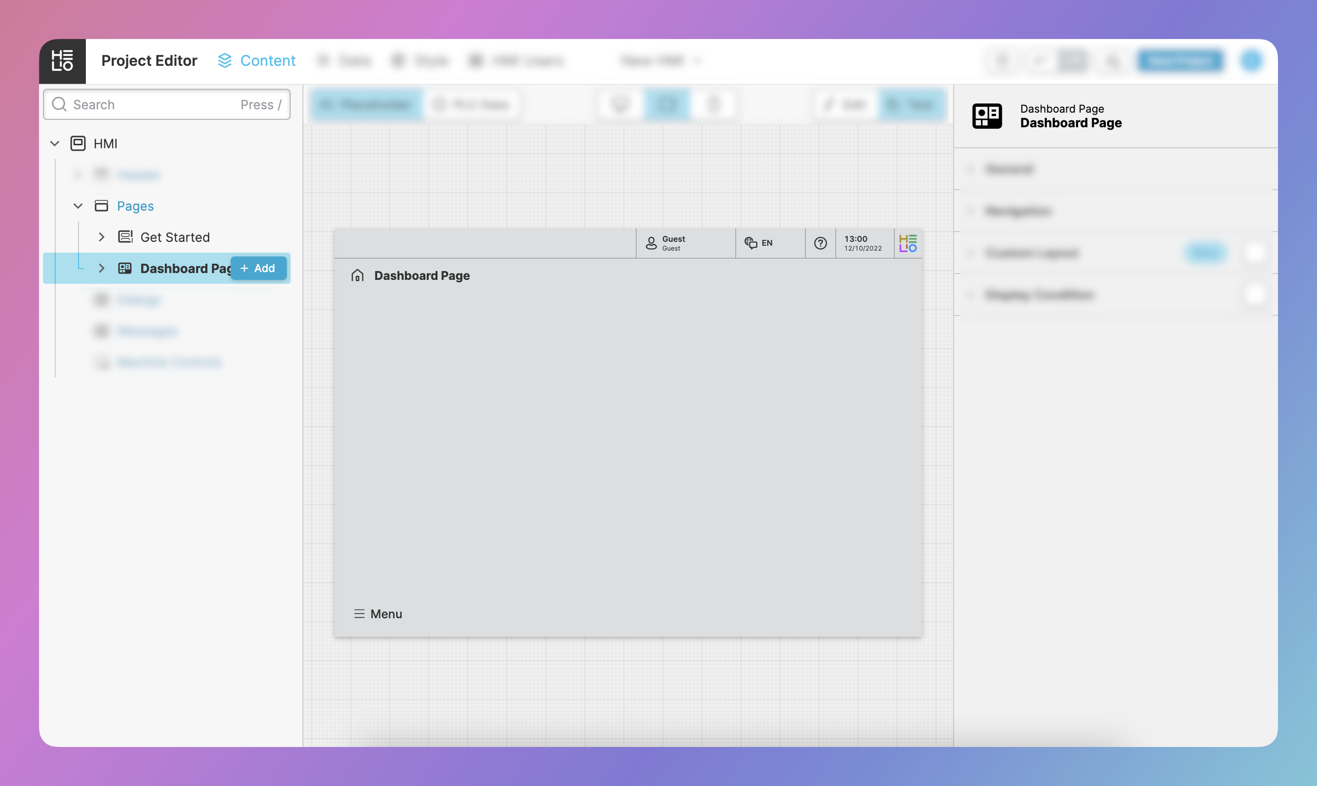 Dashboard Pagefrom this list to add a new page to your HMI.