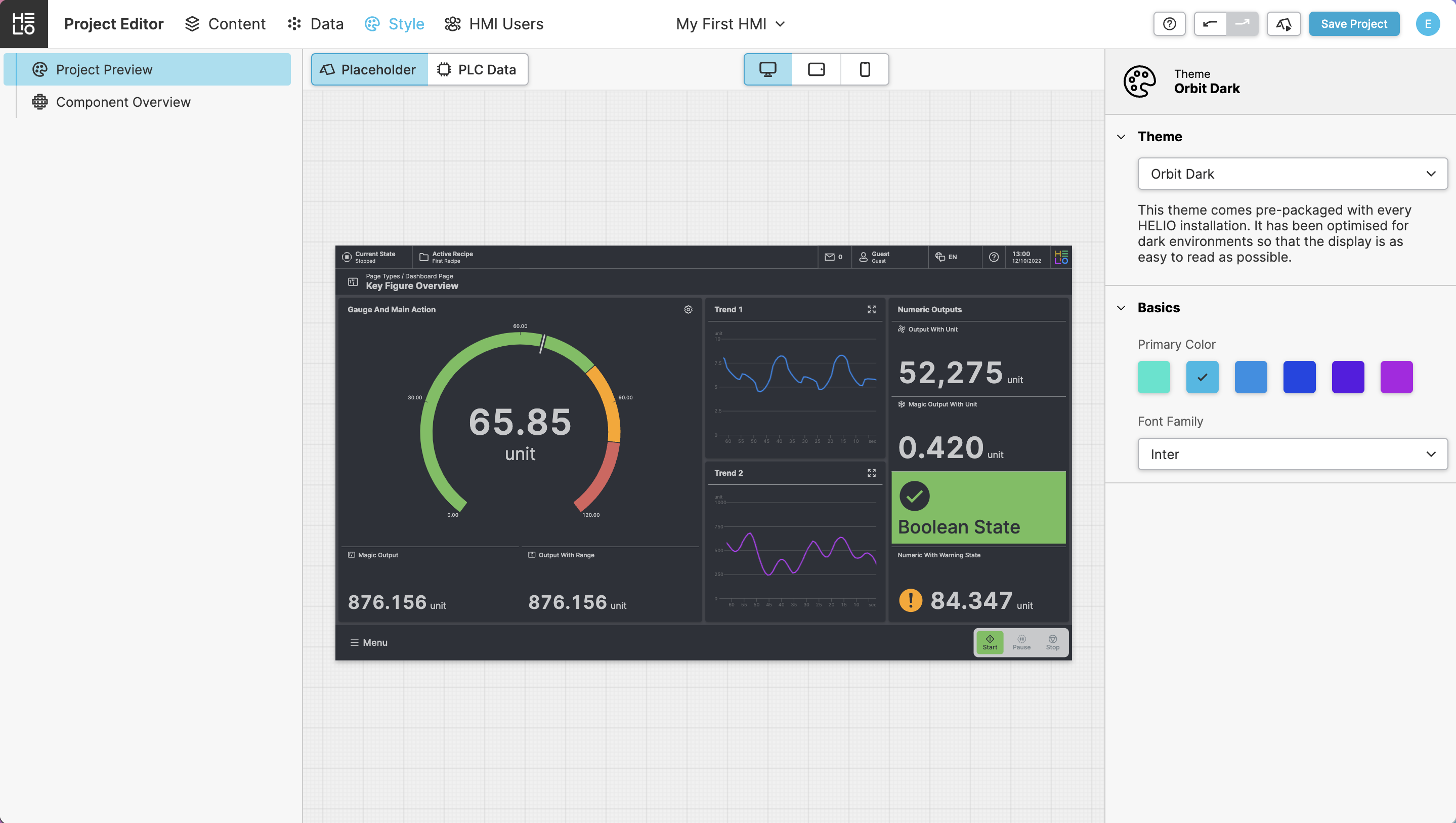 The Style Tab enables you to switch between different themes and change the appearance of your HMI. You don't need to decide on a theme right away because HELIO can switch between the available themes at any point.