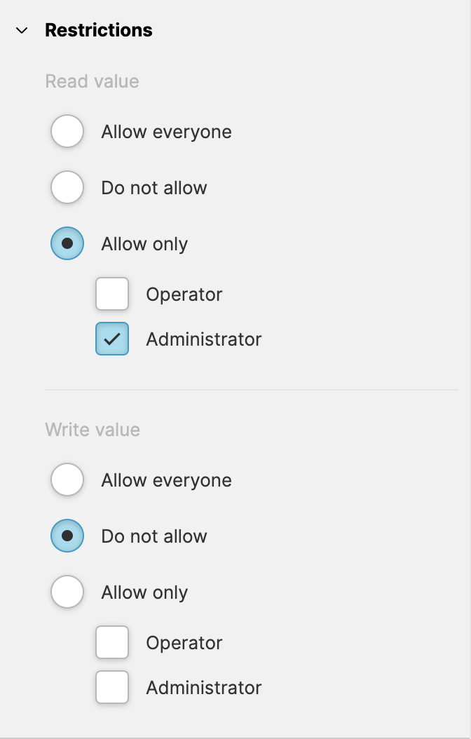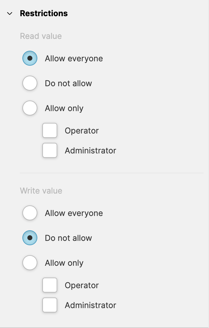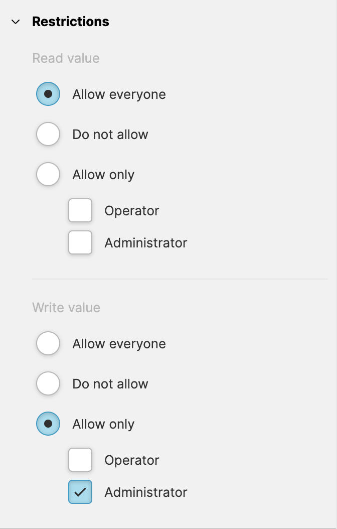 Go to the Data View and locate the HMI Data Explorer. Select the variable you would like to manipulate and locate the Restrictions property group on the right.