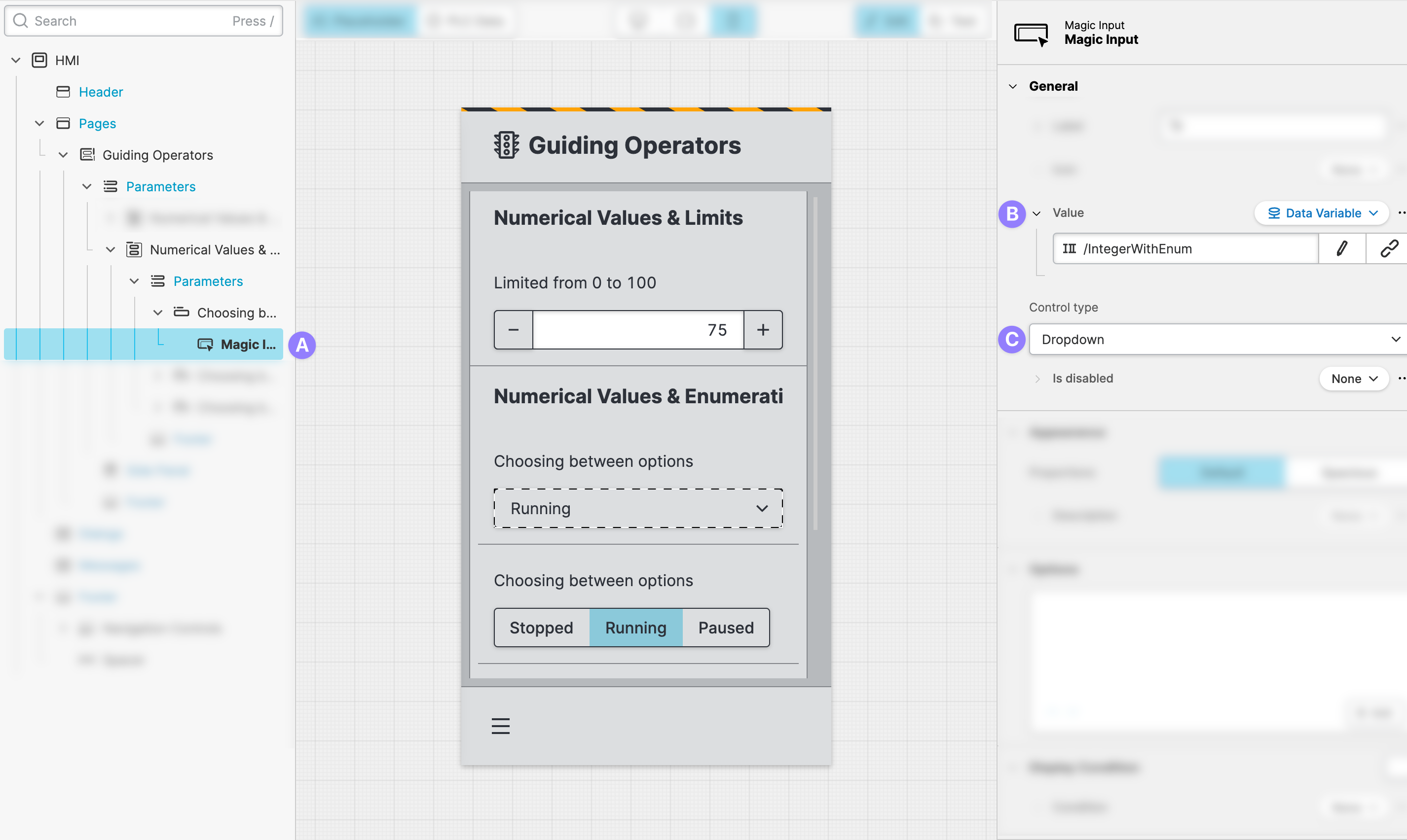 Another way to guide operators is to let them choose between distinct options. In HELIO this is done using Enumerations.