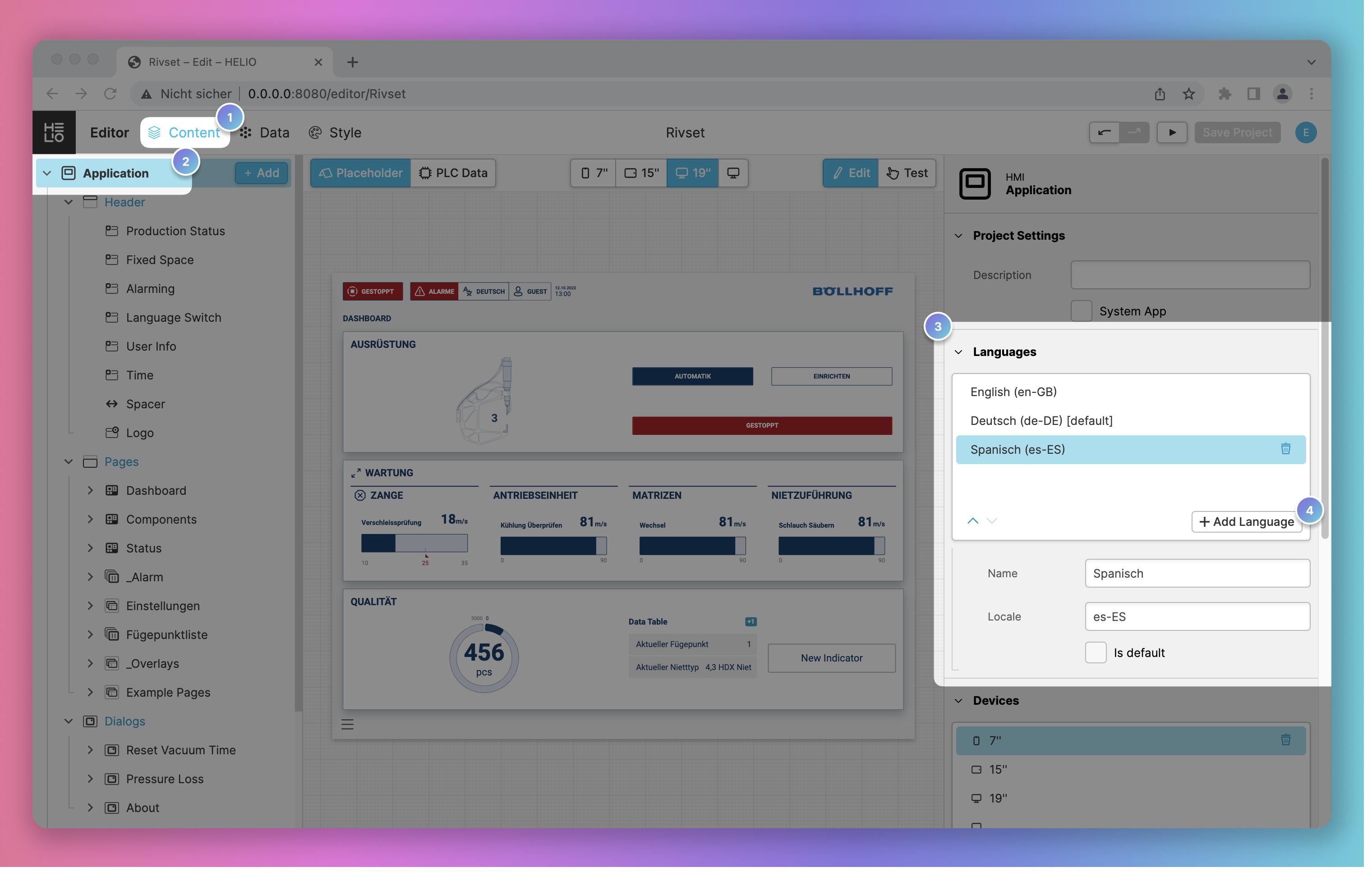 HELIO has several built-in features that make translating your content easy. First, it allows you to define texts within the HMI that you would like to be translatable using the Localizable Text (Dynamic Property).