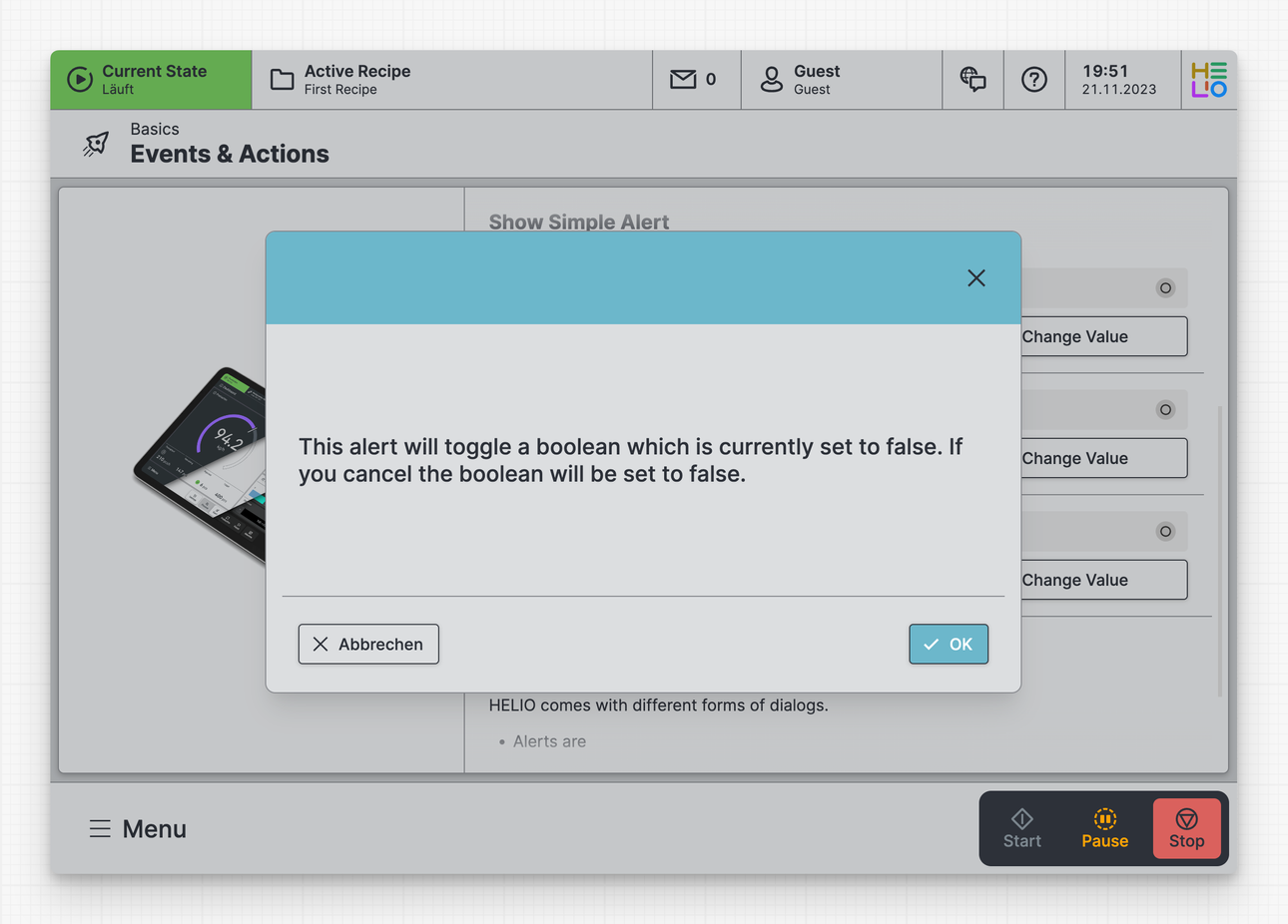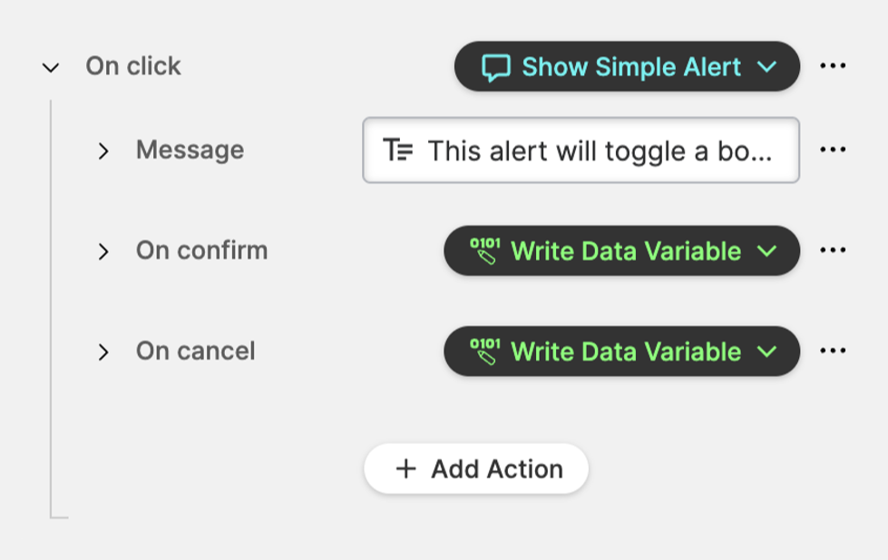 This example illustrates how to show a message and deal with both the On confirm and On cancel responses by writing a data variable.