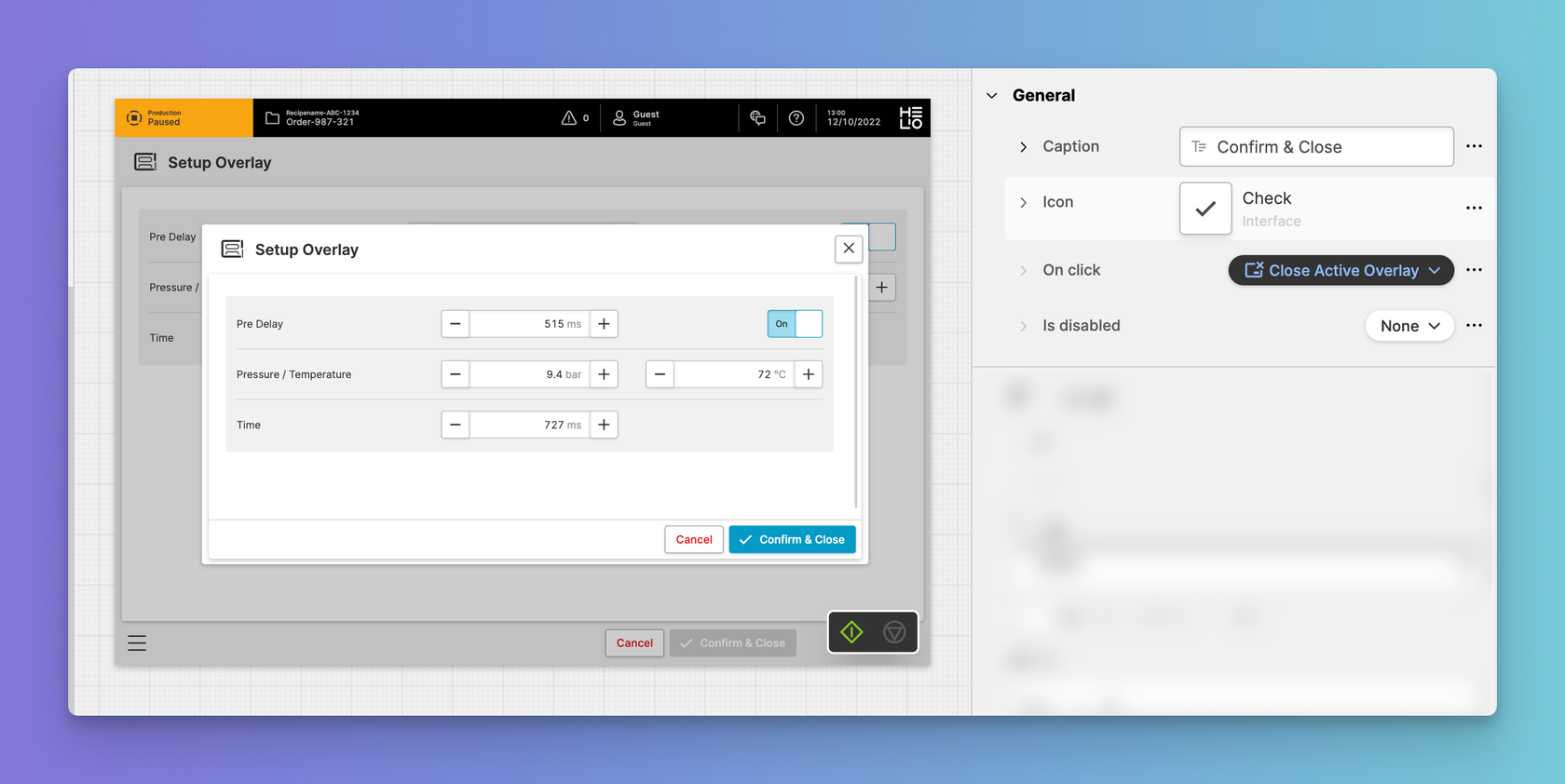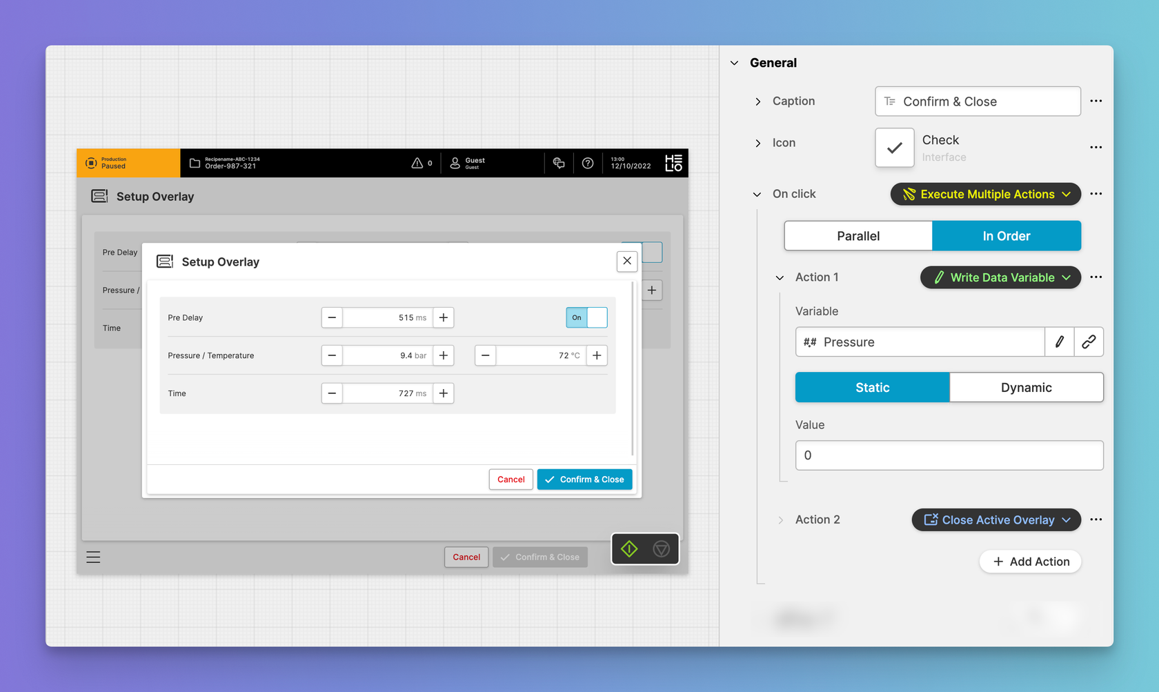 By using this approach, we can inform our PLC of a user's decision by writing some state to a variable. After triggering this action, we close the overlay that was used to gather some additional information about the decision.