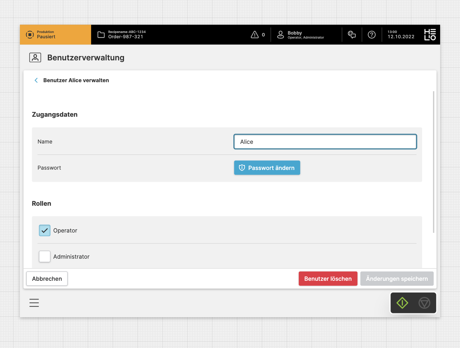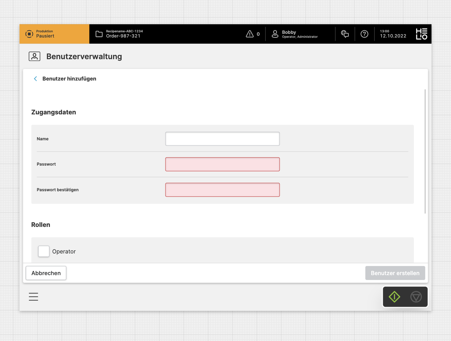 Namethat will be displayed while the User is signed into the HMI.Password– make sure that you and your users choose strong passwords to hinder unwanted access to your machine.