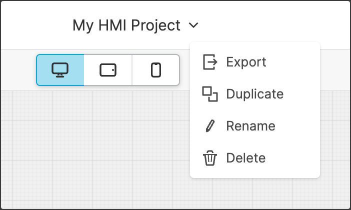 The Project Menu is located in the top bar of the Project Editor. It allows you to execute key actions on the currently open project, such as duplication and renaming.